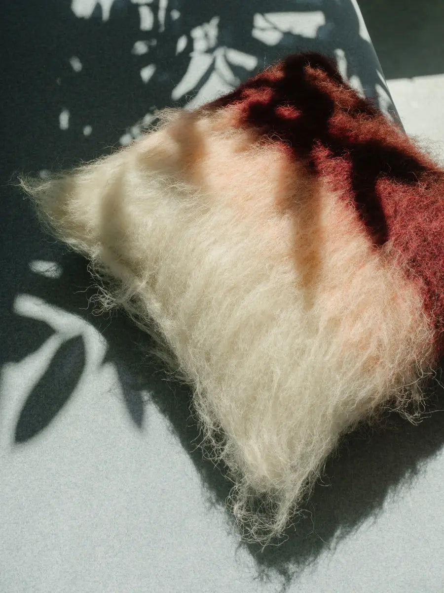 A soft play of color and texture, this handwoven wool pillow blends burgundy, pink, and creamy shades in a subtle brushed technique. Each piece is carefully crafted on an old loom, showcasing the beauty of traditional weaving and natural materials.